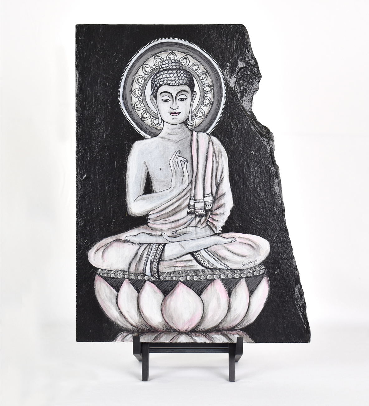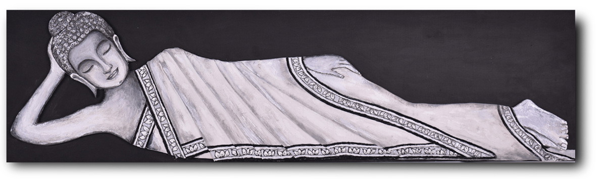 Wood on Wood Relief Artwork . Hand cut wooden Buddha . Patchwork Fabric draped and painted
